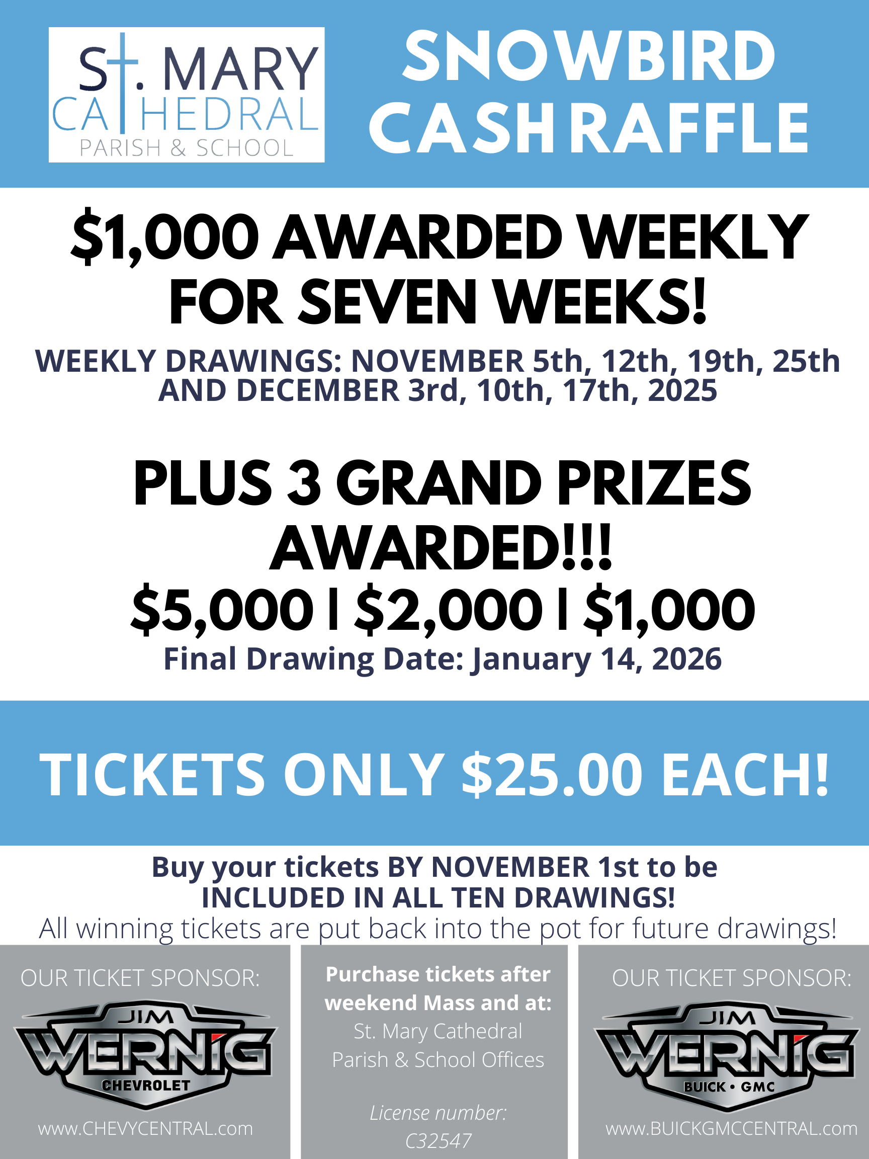 For more information on the Cash Raffle, contact Denise by E-mail: dlandrie@stmarycathedral.org or Phone: (989) 705-3569